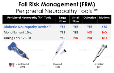 The purpose of a comprehensive diabetic foot exam is to gather as much clinical data about the condition of a person’s normal or abnormal condition in the feet of both large and small nerve fibers. A diabetic foot exam also checks people with diabetes for infection, injury, and bone abnormalities. However, over 99% of all medical providers use outdated and subjective tools (tuning fork, invented in 1711 or monofilaments, invented in 1938) to identify a progressive disease. Distal Symmetric Polyneuropathy (DSPN), a glove and stocking distribution, is the most common form of Diabetic Neuropathy (DN) and is recognized as the most troublesome complication of diabetes mellitus leading to the greatest morbidity and mortality, which accounts for the most amount of hospitalizations than all other diabetic complications combined and is responsible for up to 75% of non-traumatic amputations.
